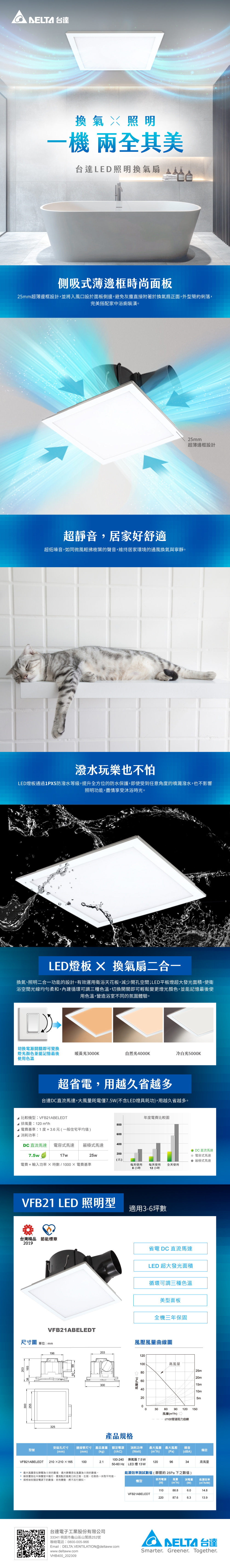 型號 : VFB21ABELEDT 安裝尺寸(mm) : 210*210*165 連接管尺寸 : 100mm 產品重量 : 2.1kg 額定電源 : 100-240V50~60Hz 消耗功率 : 換氣扇 7.5W/LED燈13W 最大風量 : 120(m3/h) 最大風壓 : 96Pa 噪音 : (dBA)34 備註 : 高風量 【LED燈具規格】 功率 13W 光通量 1000LM 色溫 暖黃光 3000K/自然光4000K/冷白光5000K